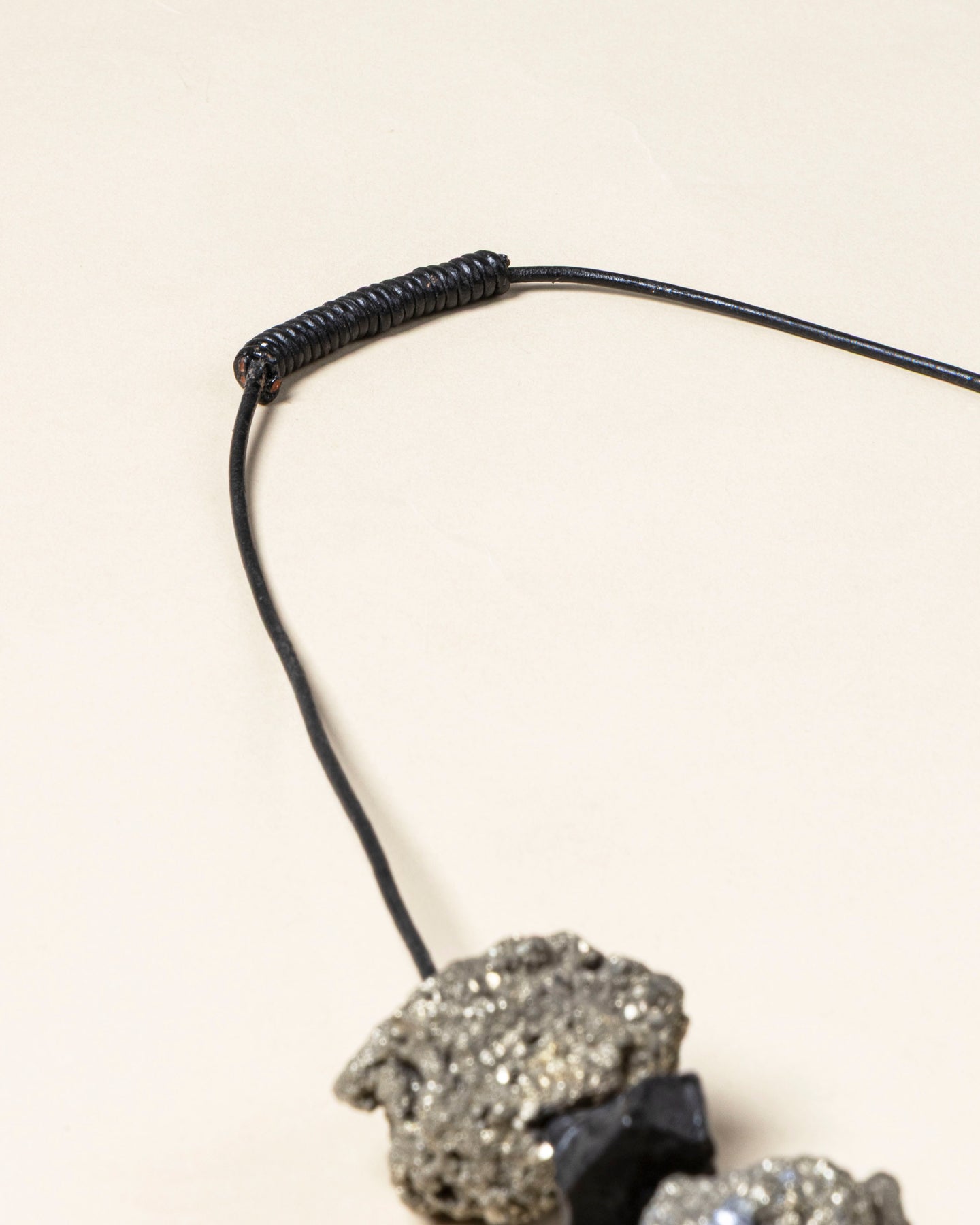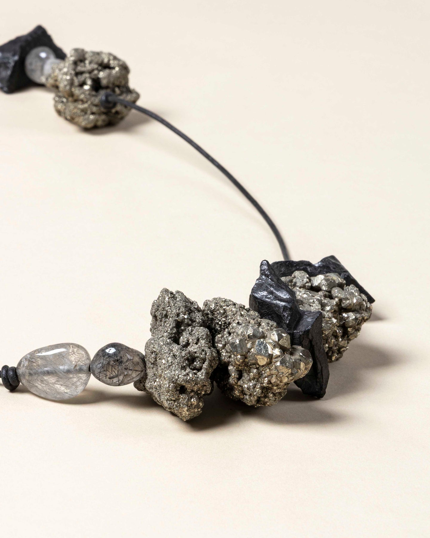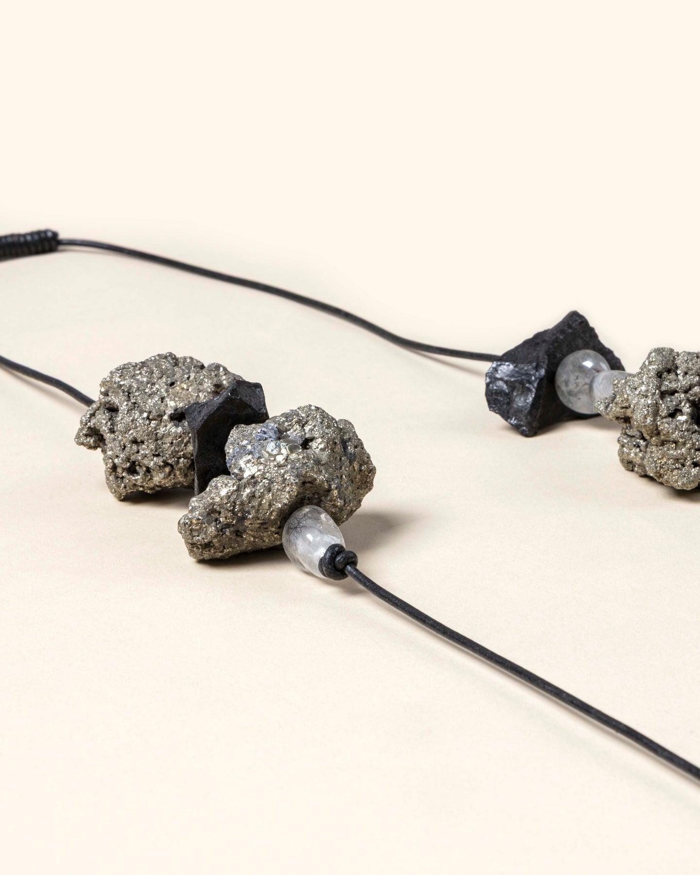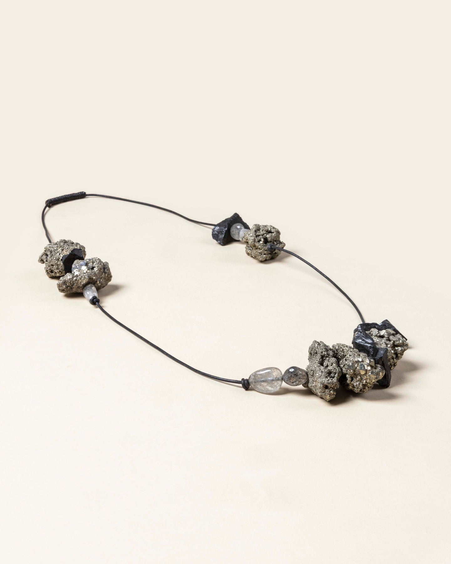 Materials: Black Tourmalien - Semi precious stone Black Rutile - Semi precious stone Pyrite - Semi precious stone Leather